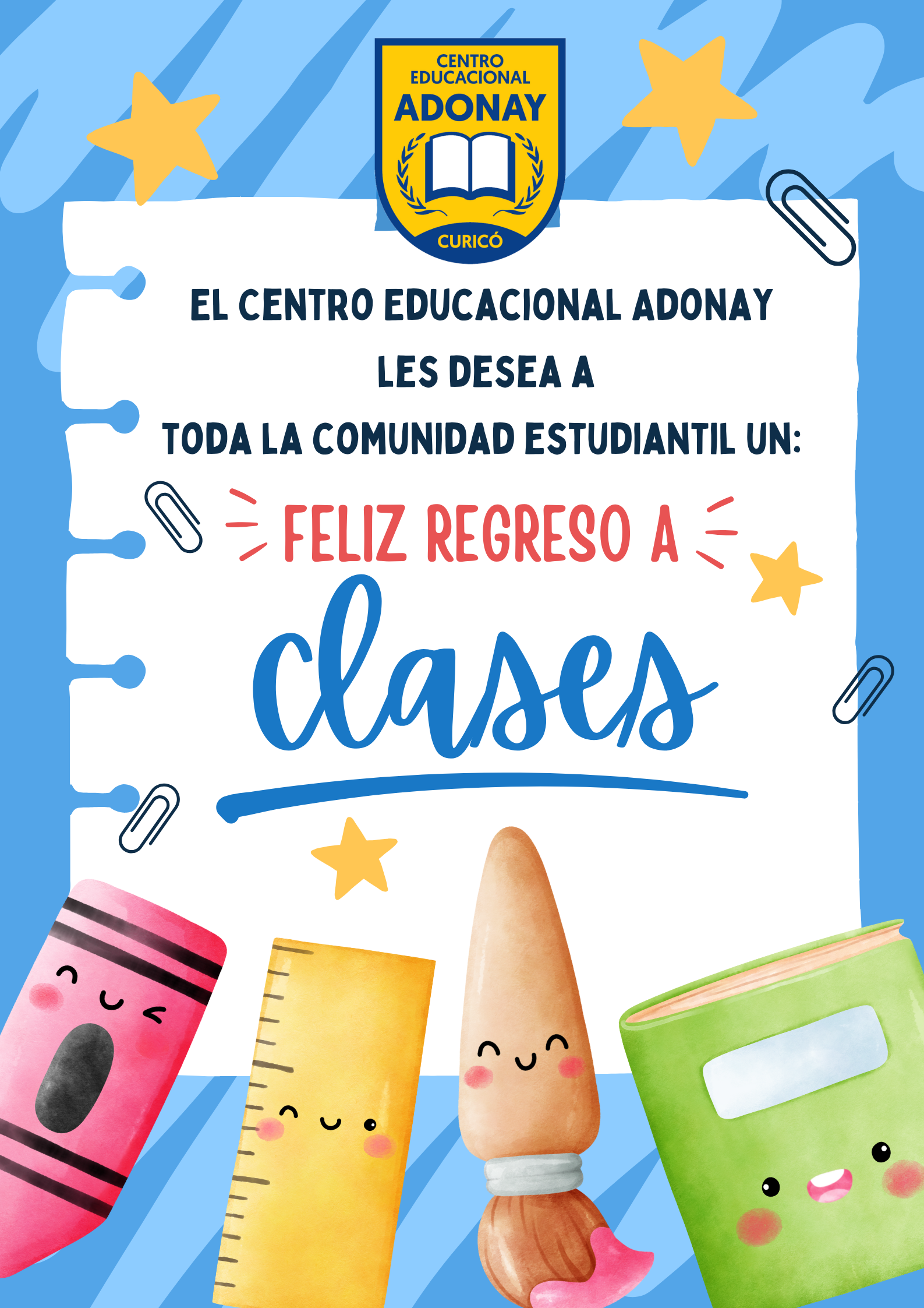 ¡Bienvenidos al nuevo año escolar de nuestro Centro Educacional Adonay! Este es un año lleno de oportunidades para aprender, crecer y fortalecer nuestra fe. Que cada día en la escuela sea una oportunidad para acercarnos más a Dios, colaborar con nuestros compañeros y dar lo mejor de nosotros en cada desafío. ¡Que este año escolar sea de bendición, sabiduría y éxito para todos!