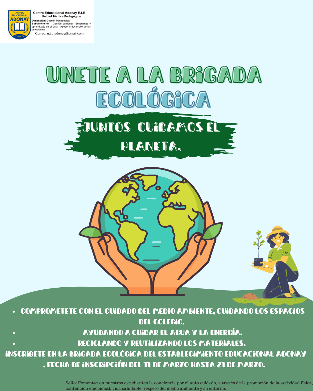 Únete a la brigada ecológica del establecimiento educacional Adonay y se parte del cambio.