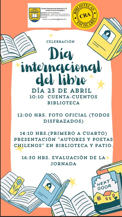 El centro educacional adonay invita a todos los integrantes de nuestra comunidad educativa a participar del día del libro en donde se solicita que puedan asistir con su respectivo disfraz enfocado a personajes de libros y/o cómic