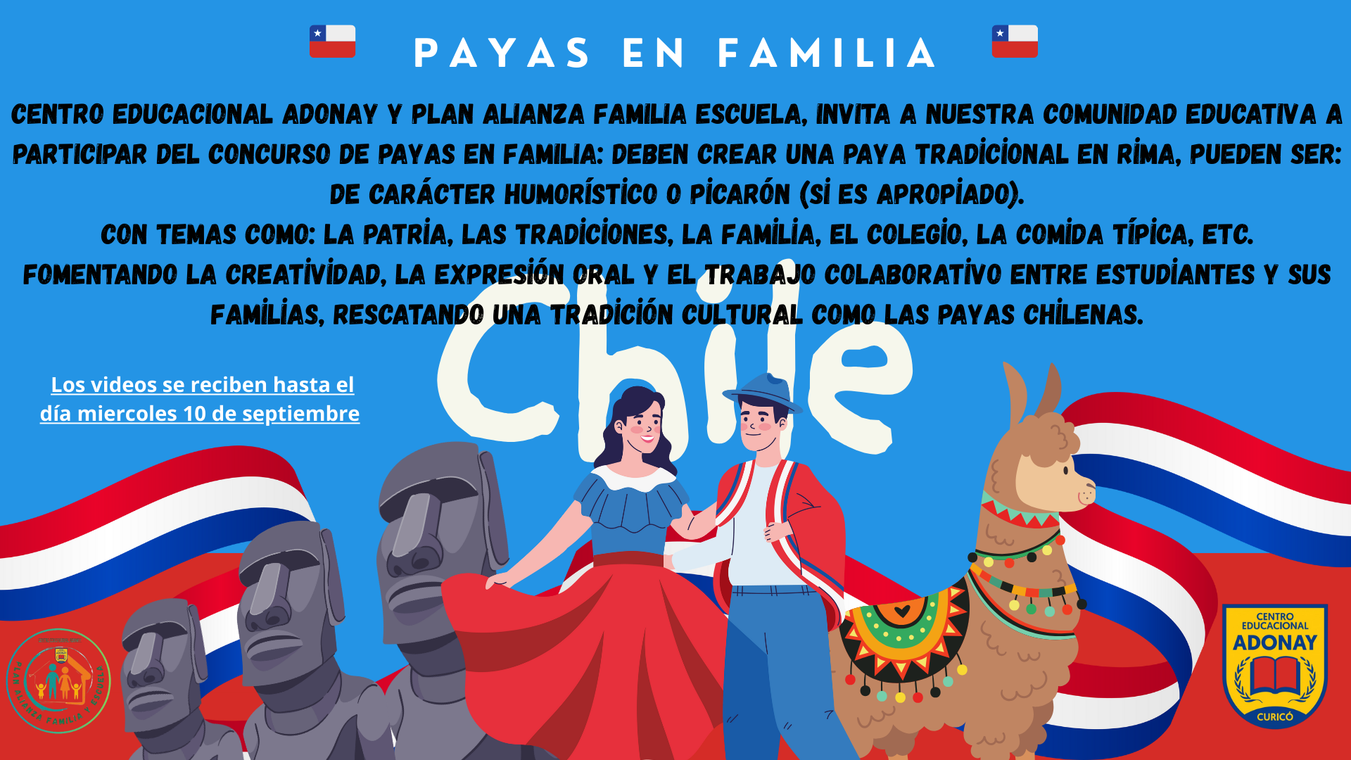 Centro Educacional Adonay y Plan alianza familia y escuela, invita a nuestra comunidad educativa a participar del concurso "Payas en Familia" deben crear una paya tradicional en rima, pueden ser: