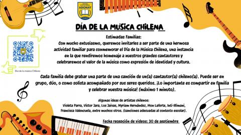 Cada familia debe grabar una parte de una canción de un(a) cantautor(a) chileno(a). Puede ser en grupo, dúo, o como solista acompañado por sus seres queridos. ¡Lo importante es compartir en familia y celebrar nuestra música! (máximo 1 minuto). ESCANEA EL CODIGO QR Y SUBE TU VIDEO. EL PLAZO ES HASTA EL DIA MARTES 30 DE SEPTIEMBRE