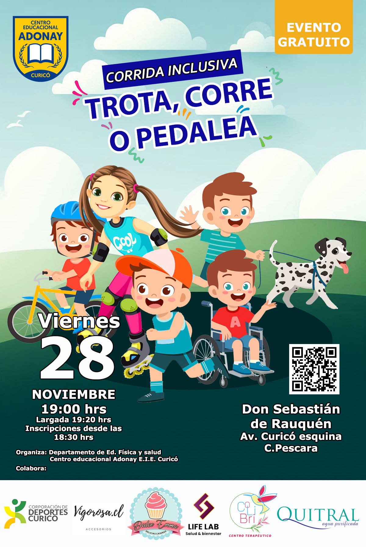 Les invitamos con mucha alegría a participar en nuestra Corrida Familiar Inclusiva, una actividad pensada para que todas y todos puedan disfrutar, independiente de sus habilidades, edades o condiciones físicas.
